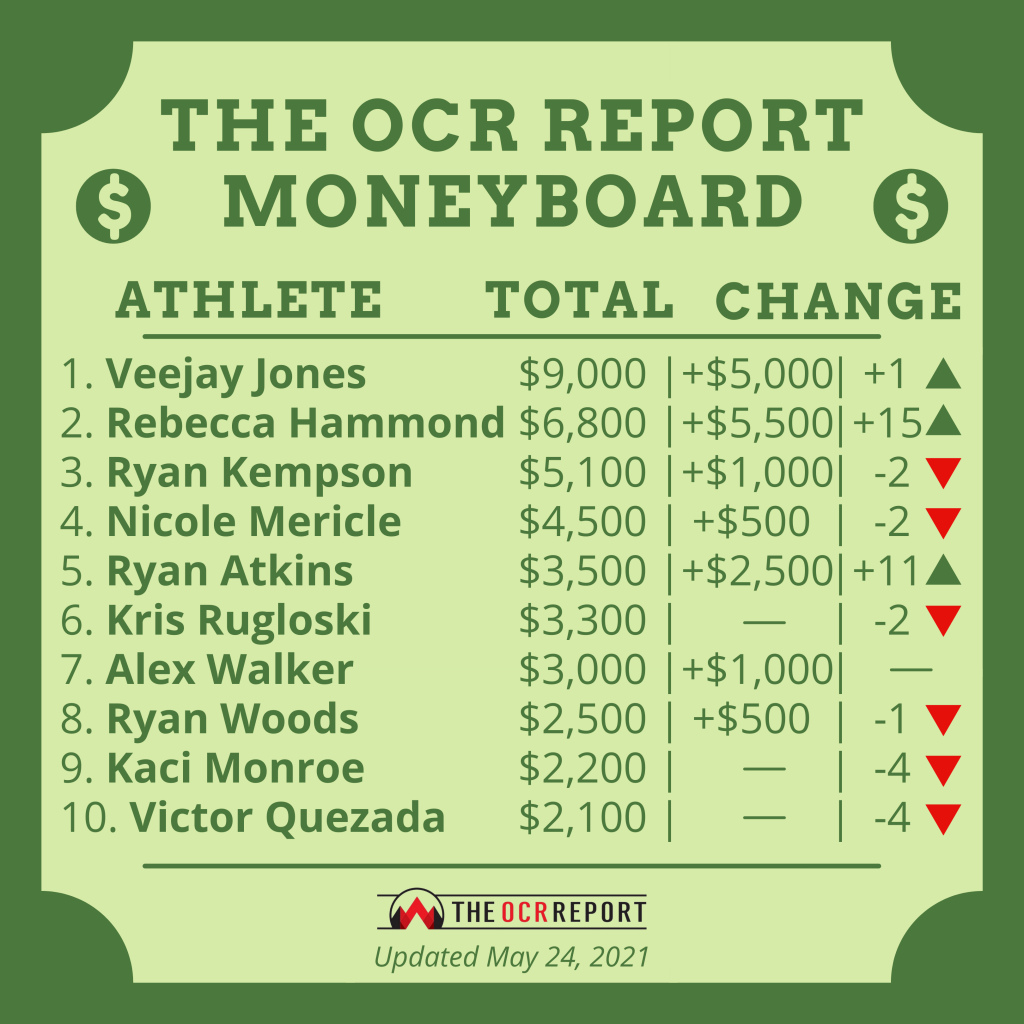 Kaci Monroe and Victor Quezada did not race OCR this weekend. Quezada did some functional fitness, but the OCR Report Moneyboard is dedicated to OCR winnings only. Monroe has $2,200 in winnings and drops four places to number nine. Quezada has $2,100 in winnings and drops four places to number ten.